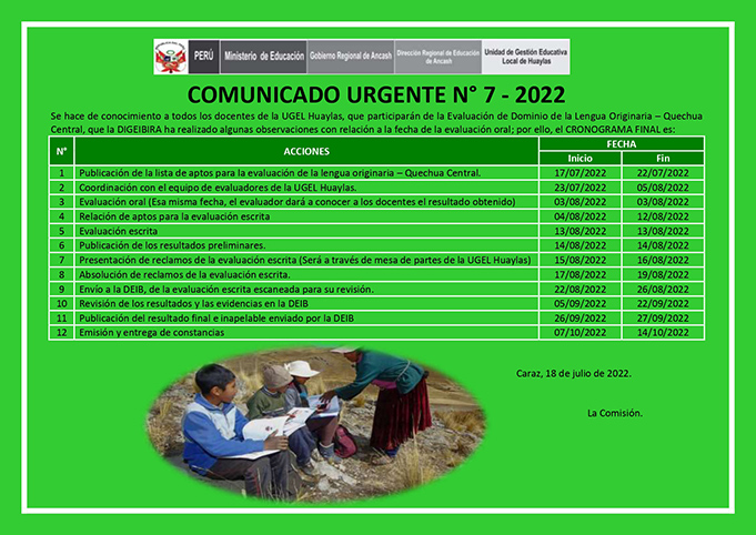 COMUNICADO URGENTE N° 7 - 2022 CRONOGRAMA FINAL de la Evaluación de Dominio de la Lengua Originaria – QuechuaPublicado: Lunes, 15 Agosto 2022 02:32 | Visto: 1354 DESCARGA AQUÍ EL CUADRO PRELIMINAR DE RESULTADOS EVALUACIÓN ESCRITA Anterior Siguiente