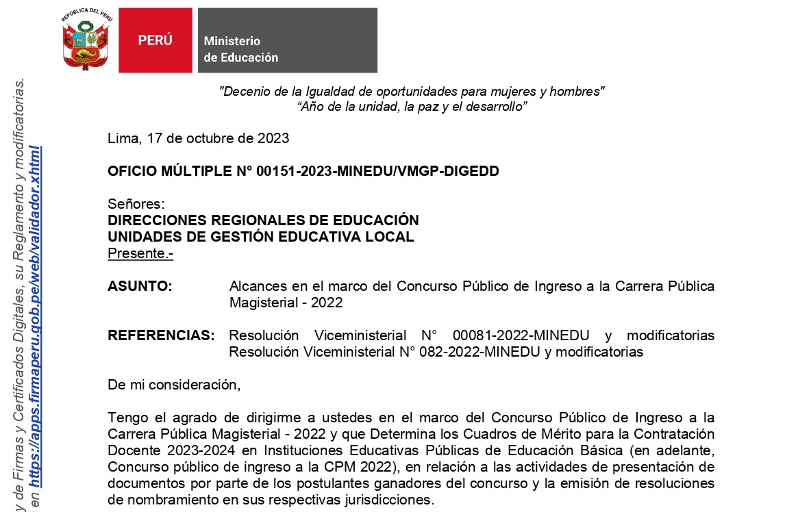 Alcances en el marco del Concurso Público de Ingreso a la Carrera Pública Magisterial - 2022Publicado: Miércoles, 18 Octubre 2023 21:35 | Visto: 680 Alcances en el marco del Concurso Público de Ingreso a la Carrera Pública Magisterial - 2022 Anterior Siguiente