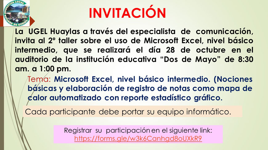 Invitación a Taller sobre el uso de Microsoft ExcelPublicado: Jueves, 26 Octubre 2023 20:12 | Visto: 629 Anterior Siguiente