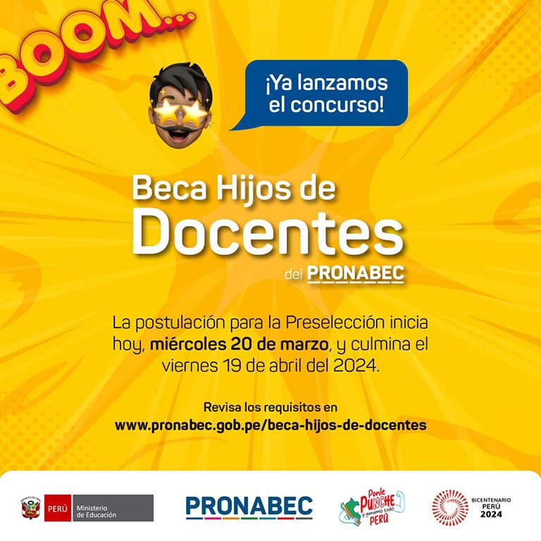 BECA HIJOS DE DOCENTES PRONABECPublicado: Viernes, 22 Marzo 2024 01:27 | Visto: 1181 Descargar ... BASES DEL CONCURSO BECA DE EXCELENCIA ACADÉMICA PARA HIJOS DE DOCENTES 2024 Anterior Siguiente
