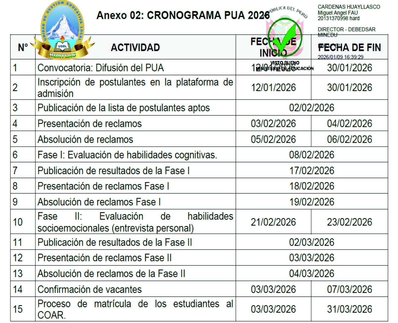 CRONOGRAMA PARA EL PROCESO ÚNICO DE ADMISIÓN COAR 2026Publicado: Martes, 13 Enero 2026 17:31 | Visto: 128 CRONOGRAMA PARA EL PROCESO ÚNICO DE ADMISIÓN COAR 2026 Anterior Siguiente