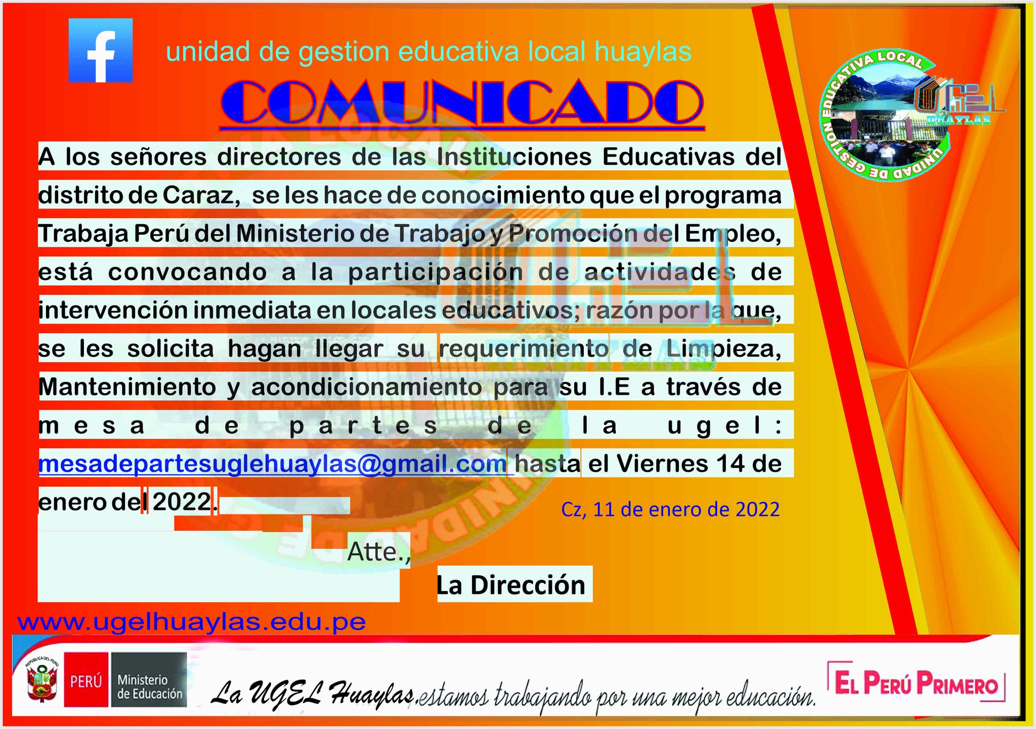 DIRECTORES DE LAS II.EE DE CARAZ HACER LLEGAR SU REQUERIMIENTO DE MANTENIMIENTO Y ACONDICIONAMIENTO PARA SU IEPublicado: Miércoles, 12 Enero 2022 12:50 | Visto: 1345 Anterior