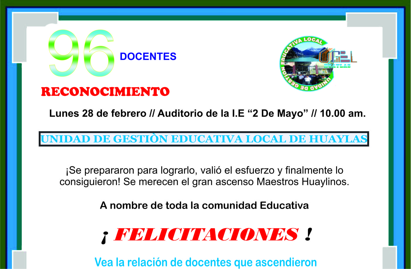 Reconocimiento a los Maestros Huaylinos que lograron su ascenso el 2022Publicado: Martes, 22 Febrero 2022 02:56 | Visto: 2045 Relación de docentes de la UGEL Huaylas que ascendieron el 2022 Anterior Siguiente