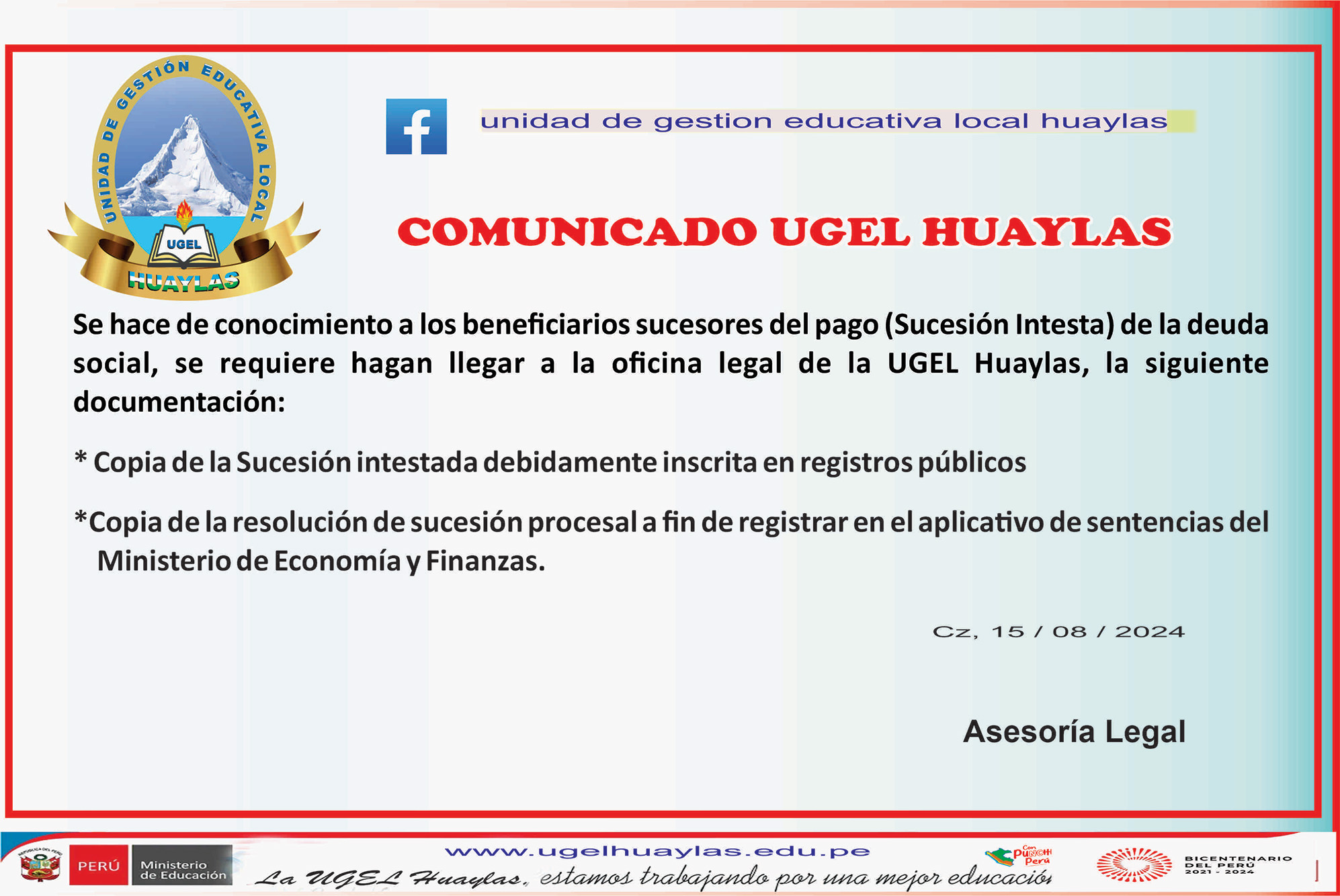 COMUNICADO DE ASESORIA DE LA UGEL HUAYLAS _ BENEFICIARIOS SUCESORES Publicado: Jueves, 15 Agosto 2024 22:22 | Visto: 753BENEFICIARIOS SUCESORES Anterior Siguiente